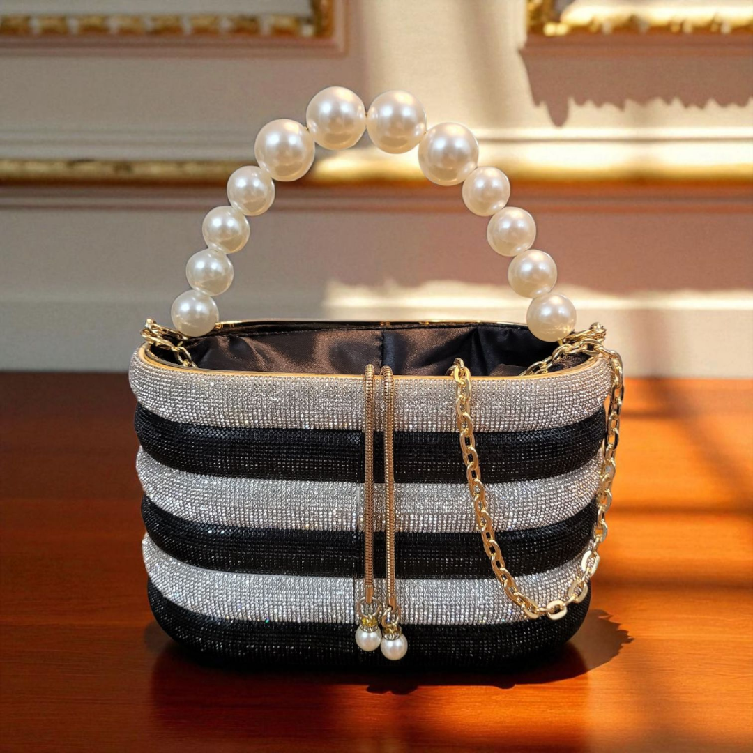 A sparkling mini handbag with a statement pearl handle. Available in stunning colors to match every mood and moment.